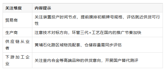 釜内合金产品及高性能抗冲共聚物长期以来在国内存在一定的进口依赖,尤其是在汽车、医疗等领域。本装置的落地,具有一定的进口替代战略意义,同时也将对该细分市场的供应弹性产生直接影响。贸易商应关注装置投产后初期试运行牌号方向,提前布局渠道对接。
